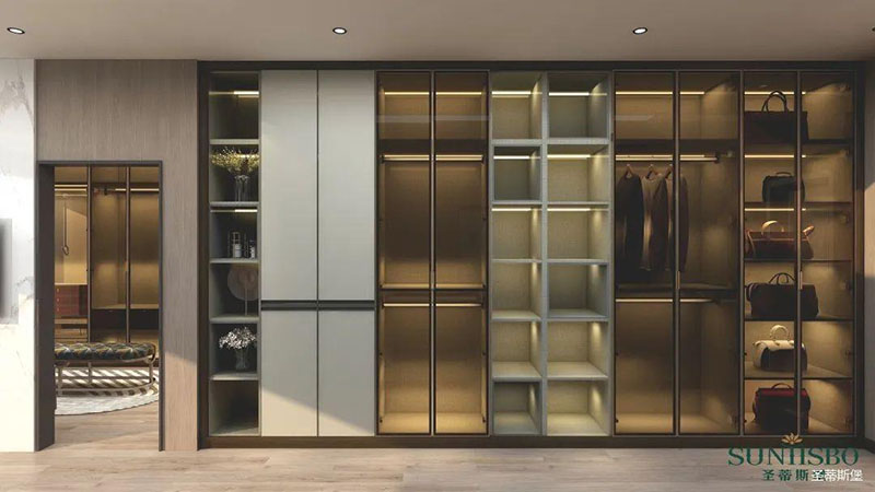 衣帽間開放式置頂設計,在追求簡單到極致的基礎上,給人感官一種簡約整潔的整體感受。打破常規的空間儲藏方式,脫離一切浮華與不實用,僅用最簡單的線條反映出主人優雅的高品味。