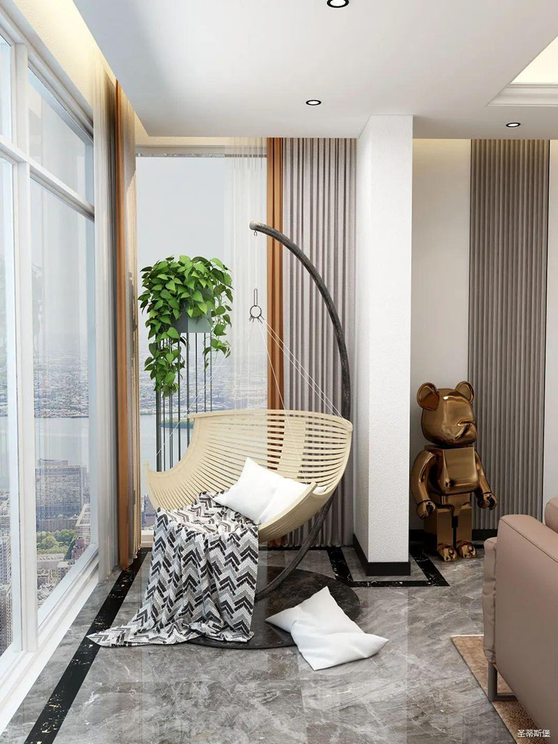 陽臺上大面積的落地窗,將頂層的位置優勢完美展現,視野與采光都得到了保證,站在窗邊就能俯瞰蒞臨江湖的城市美景。陽臺上留一隅悠閑的小角落,置入竹編狀的吊椅,閑暇時光都可以在這度過。