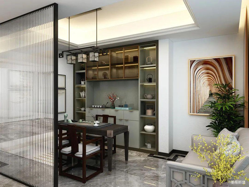 客廳與茶室之間以長虹玻璃隔斷,有效的劃分功能區,為空間展現一番“猶抱琵琶半遮面”的東方意境美。茶室將意式極簡與傳統風格糅合,摒棄繁雜、刻板的形式,以含蓄的現代極簡詮釋著東方美學,展現著傳統的待客之道。實木與鎢金金屬質感碰撞,有棱有角,高級感頃刻得到了升華。