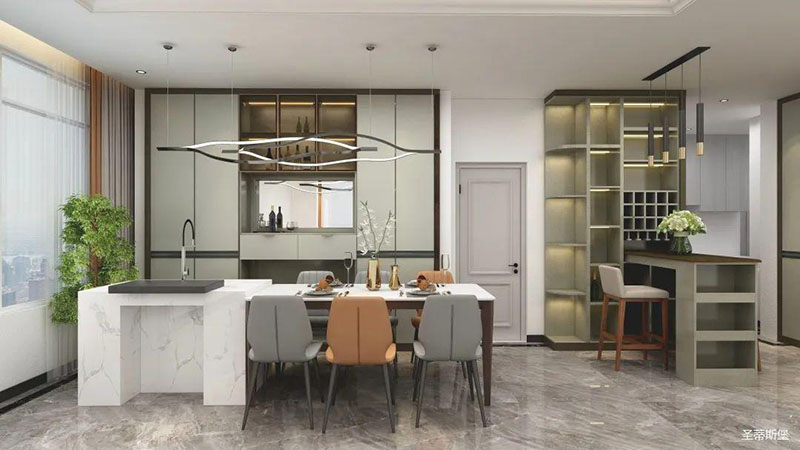 餐廚開放式設計,令空間更為清透明亮。色系一致的餐邊柜,封閉與開放式儲******立又統一,正面鑲嵌玻璃,延伸了視覺空間,僅用簡約線條區分,將意式極簡形式展現。造型別致的金屬線條燈飾,給整體空間帶來了靈動感。