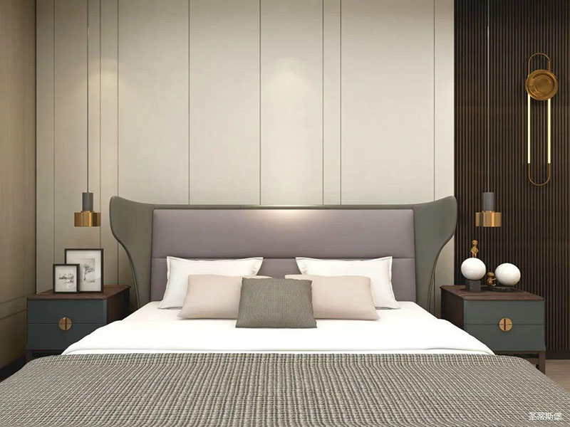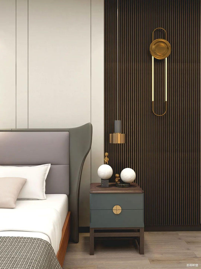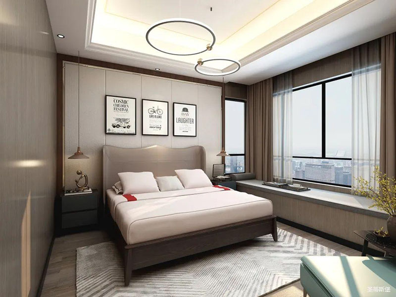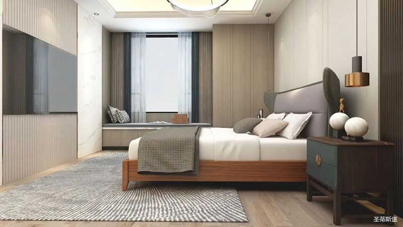 臥室精簡有致,從質感出發,打造由內而外的優雅奢華感。背景墻、地板、地毯均擁有較強的肌理感,在加上金屬軟裝飾物調和,讓空間在低調內斂的基礎上又不失時尚的高級感,飄窗進階為溫馨的一角,閑暇時,則可倚窗而坐,品一杯紅酒,感受生活中的愜意時光。
