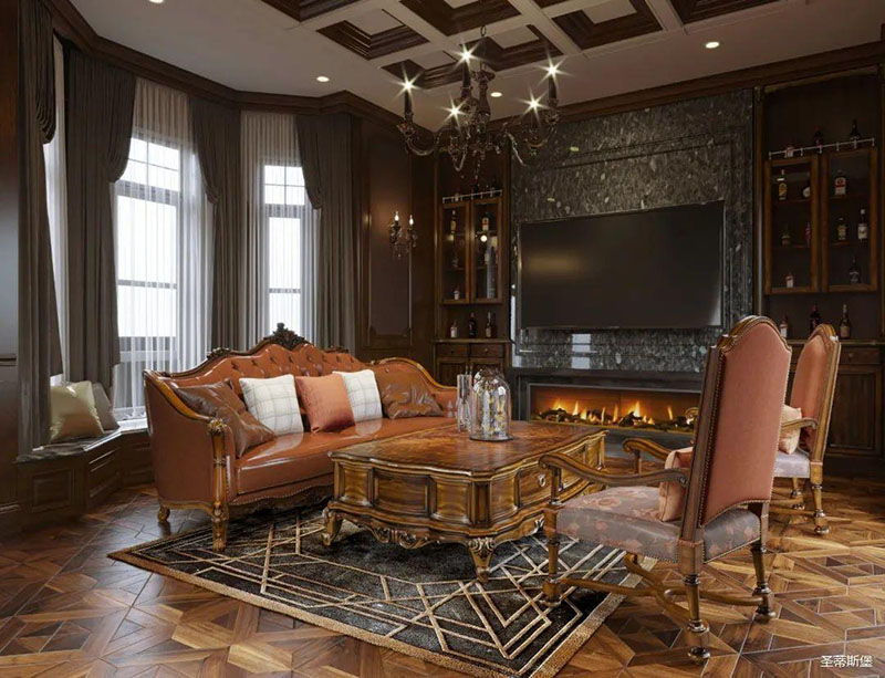 進(jìn)入客廳,純正美式城堡氣息撲面而來(lái),大理石電視背景墻被實(shí)木對(duì)稱鑲嵌,兩側(cè)置頂實(shí)木酒架更添美式風(fēng)情。純正美式風(fēng)格沙發(fā),被流暢光滑的實(shí)木線條包圍,邊角之處盡顯柔美,真皮搭配全實(shí)木藝術(shù)雕刻,貼心的軟包設(shè)計(jì),讓脊椎盡情舒展。霸氣獸腳茶幾,將美式的粗獷大氣體現(xiàn)的淋漓盡致,精美絕倫的實(shí)木單椅在樸實(shí)自然的背景里顯得格外精致美好!