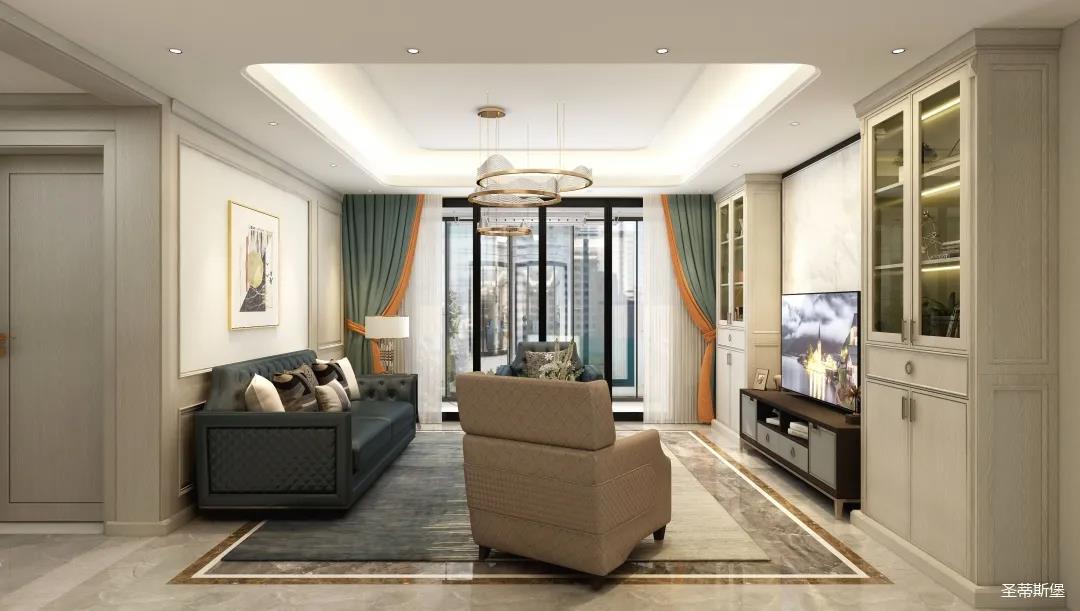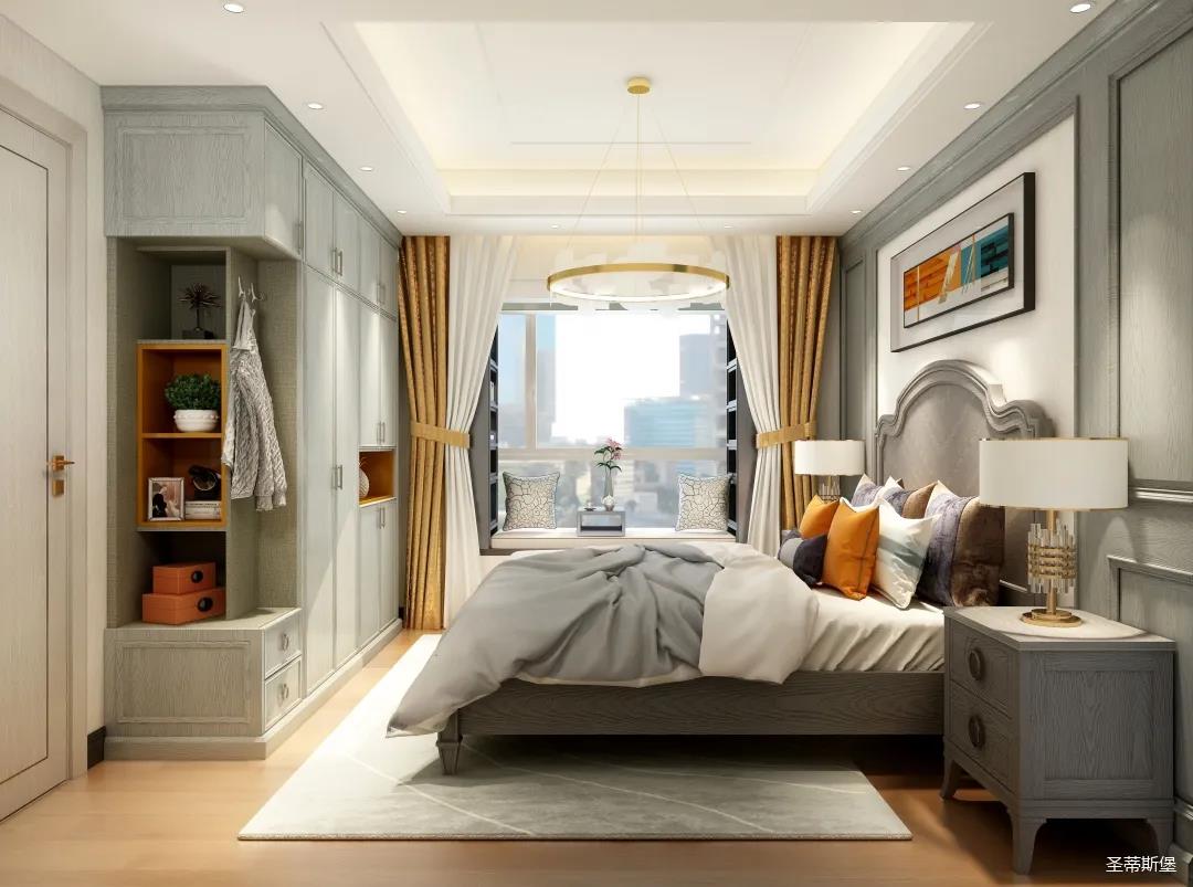 ▲室內(nèi)的環(huán)形水晶吊燈,讓空間明亮而高級(jí),淡雅內(nèi)斂的洛卡灰,在些許愛(ài)馬仕橙的亮色點(diǎn)綴下,讓空間色彩跳脫又靈動(dòng)。飄窗設(shè)計(jì),使光線(xiàn)毫無(wú)保留的散落空間,臥室通過(guò)自然光線(xiàn)與實(shí)木的洗禮,充滿(mǎn)著溫暖陽(yáng)光的氣息。