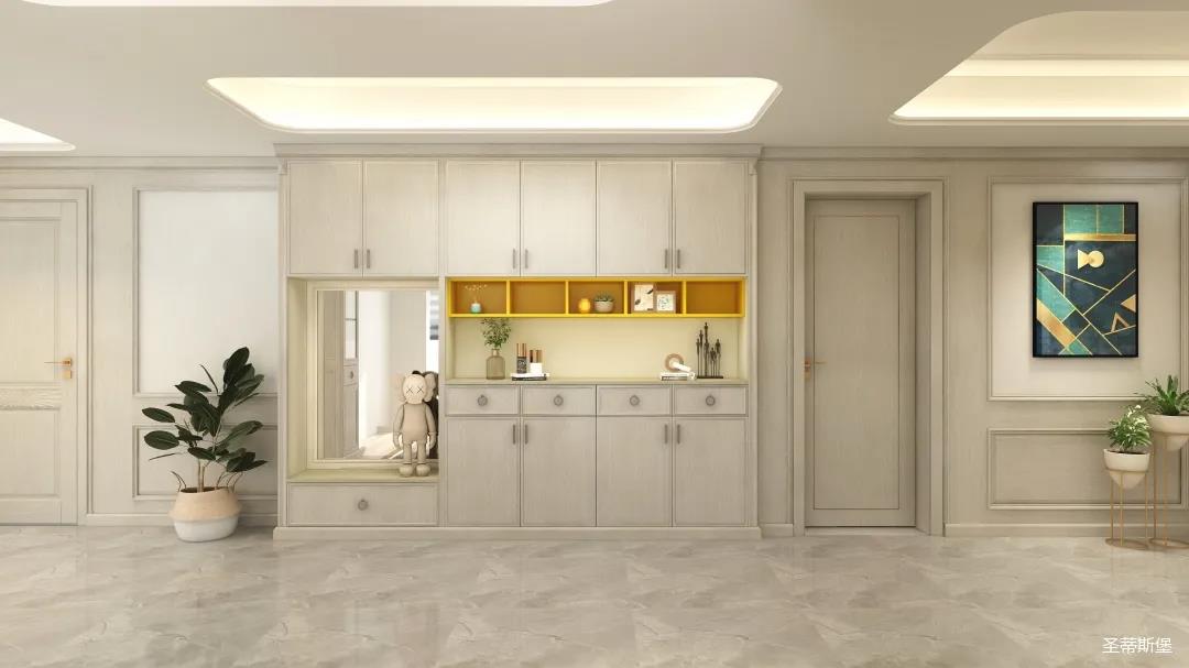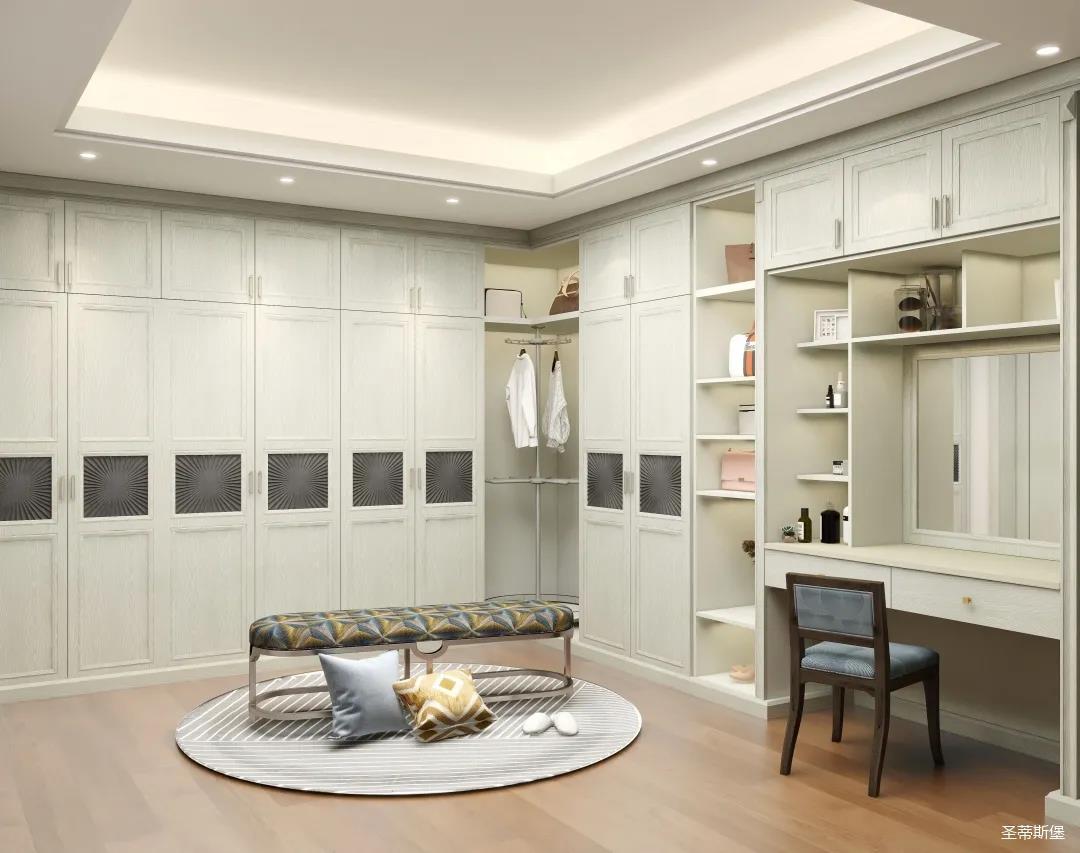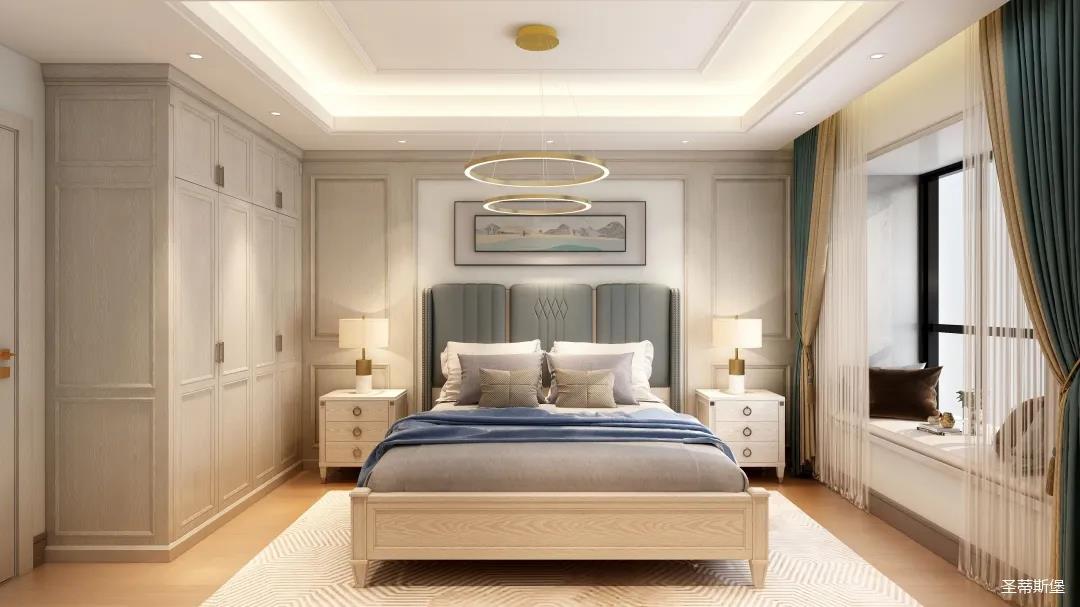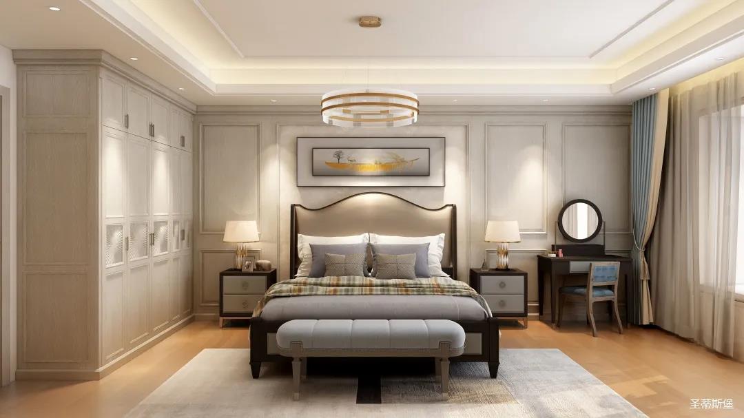 ▲業(yè)主喜歡低調(diào)輕奢的空間格調(diào),設(shè)計(jì)師從功能出發(fā),賦予空間舒適的感受,打造專(zhuān)屬的衣帽間,滿(mǎn)足業(yè)主日常買(mǎi)買(mǎi)買(mǎi)的儲(chǔ)物喜好。同時(shí)也將藝術(shù)元素融入美式現(xiàn)代風(fēng)格,利用空間的色彩、紋理、家具、配飾、光線(xiàn)等表達(dá)空間情緒,再以黃銅金屬加持,營(yíng)造溫馨愜意的家居睡眠氛圍。