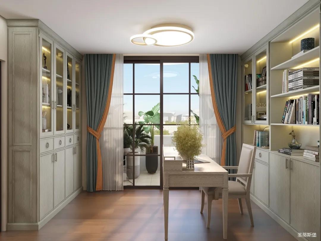 ▲書(shū)房設(shè)計(jì)不放過(guò)每一面墻,實(shí)木鋪滿(mǎn)整個(gè)空間,親近自然的靜謐感油然而生,陽(yáng)光透過(guò)玻璃灑進(jìn)來(lái),落在地面上形成斑駁光影,一本喜愛(ài)的書(shū)、一杯咖啡、沉浸在閱讀的樂(lè)趣之中,時(shí)光荏苒、歲月靜好。