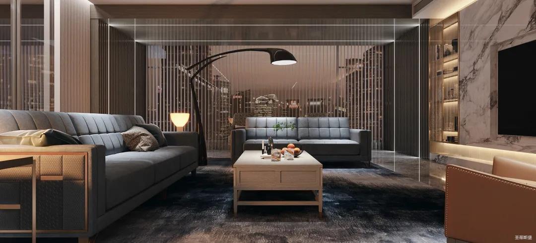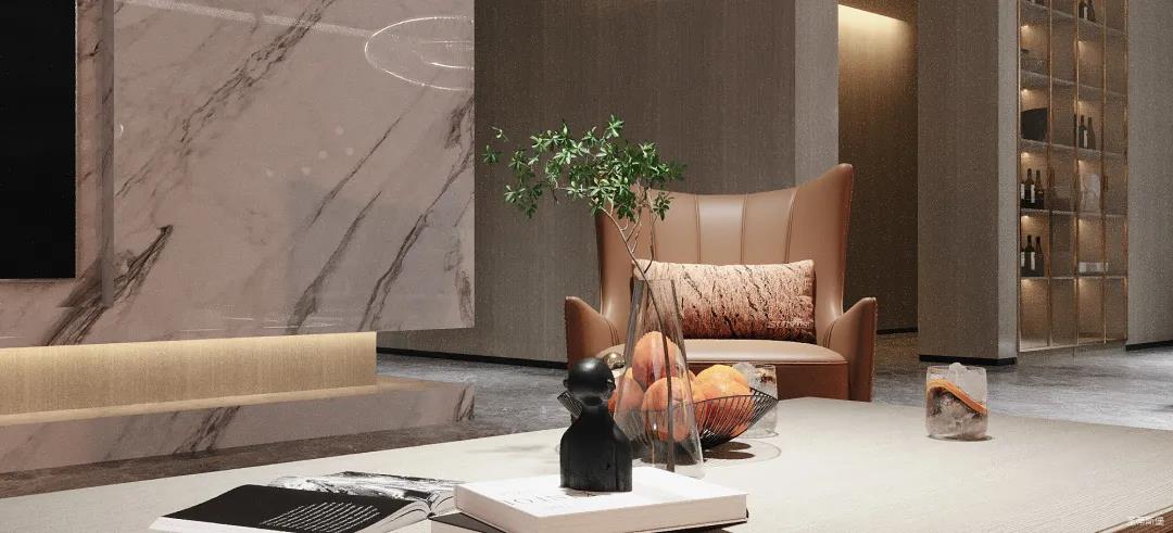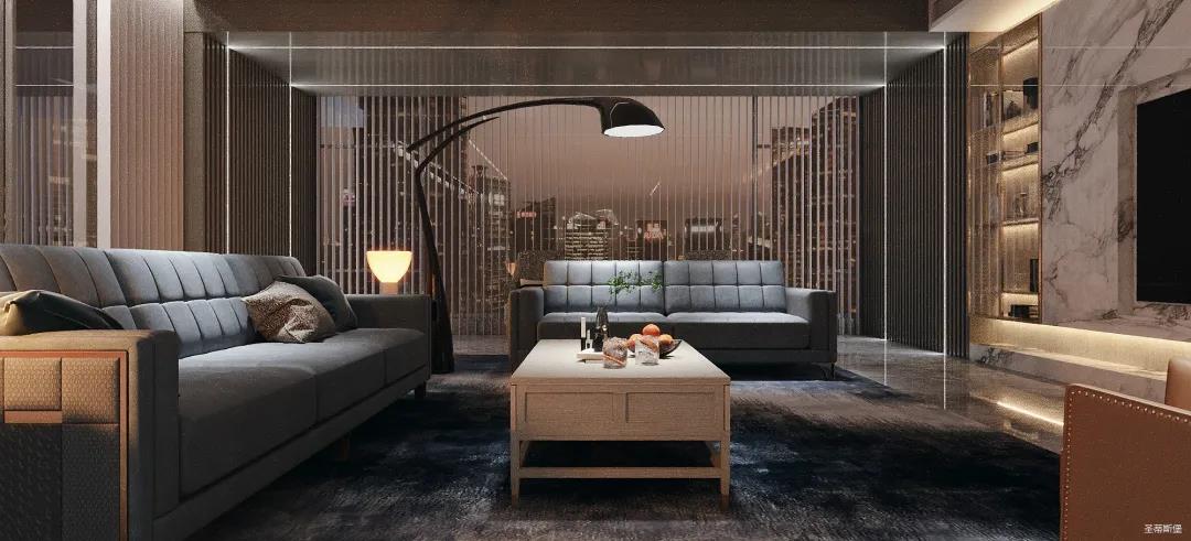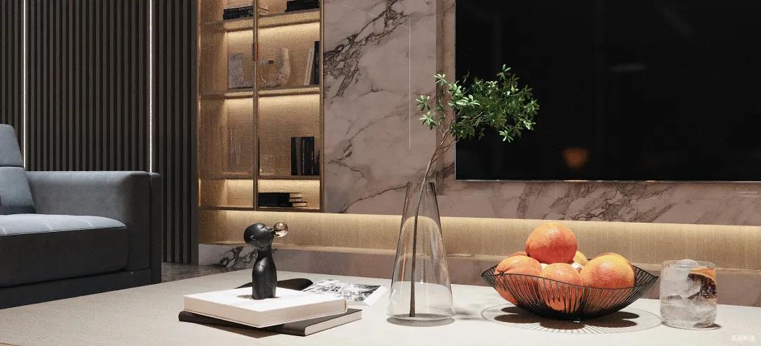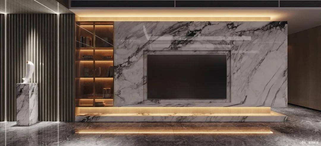 為了減輕現代都市工作的忙碌,客廳設計更偏向于對生活“解壓”的極簡,精選自然紋理的大理石與實木定制柜做一體化設計,并在電視背景墻下半部分做挑空設計,安裝個性十足的線性燈帶,延伸客廳視覺深度。