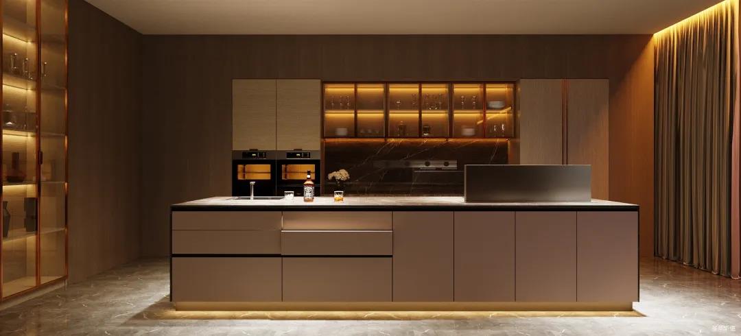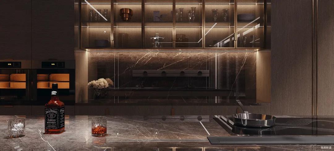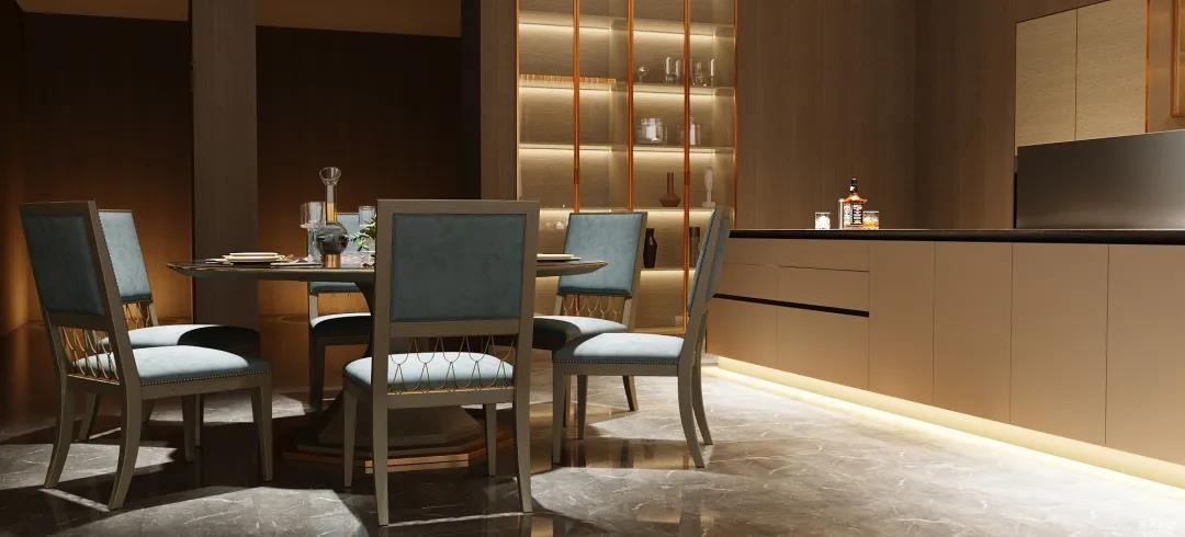 餐廚的極簡也可兼具多元,以一字內嵌式展開的廚區收納柜,兼顧了從杯具、調料等廚用材料收納到廚電歸置動線功能處理。在展示區域,玻璃隔板組合實木定制柜的表現形式,更是提升了空間的明亮度與寬闊感。