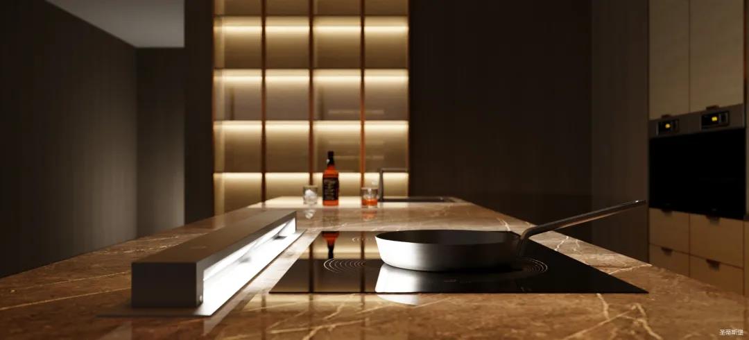 餐廳空間納入了多重材料,金屬、石材、木飾的搭配呼應著飽和度較高的軟裝,將都市的舒適感與藝術氣息融為一體。極簡的單色線條美感在不同的材質中形成明暗對比,開放式的包容空間格局實現了隱藏收納和陳列外漏的雙重功能。暖系的層板燈搭配著獨具特色的烹飪空間,營造出具有儀式感的用餐體驗。
