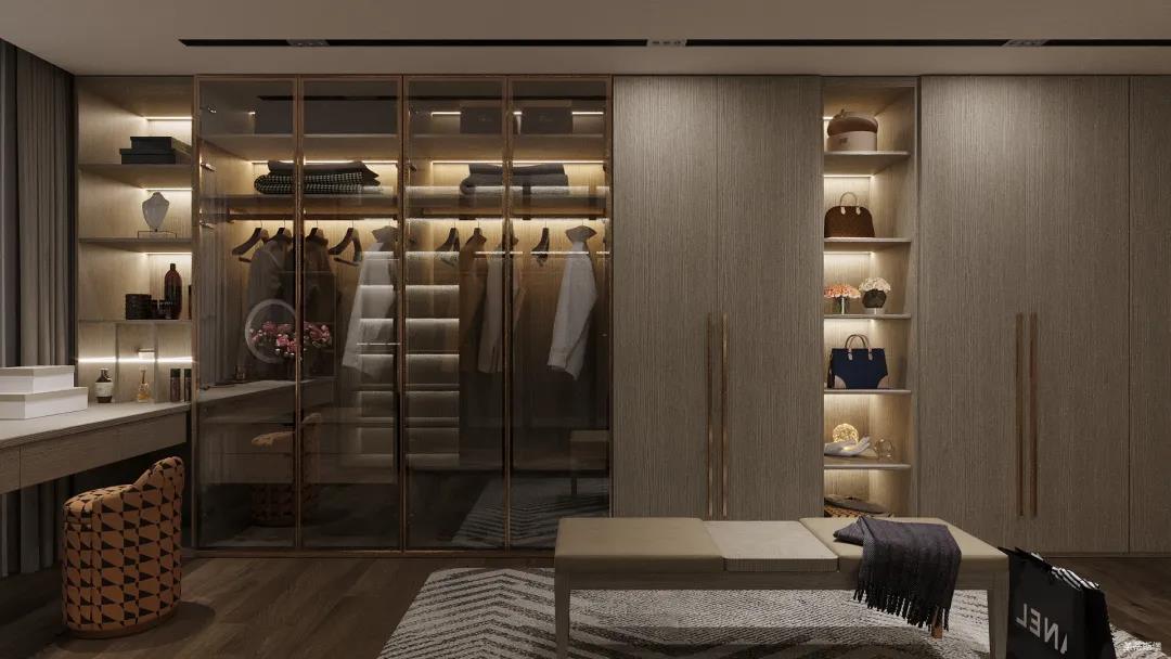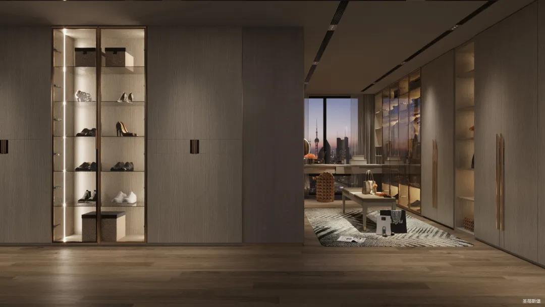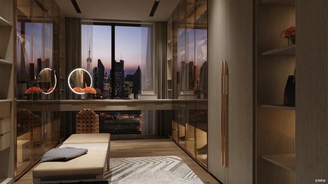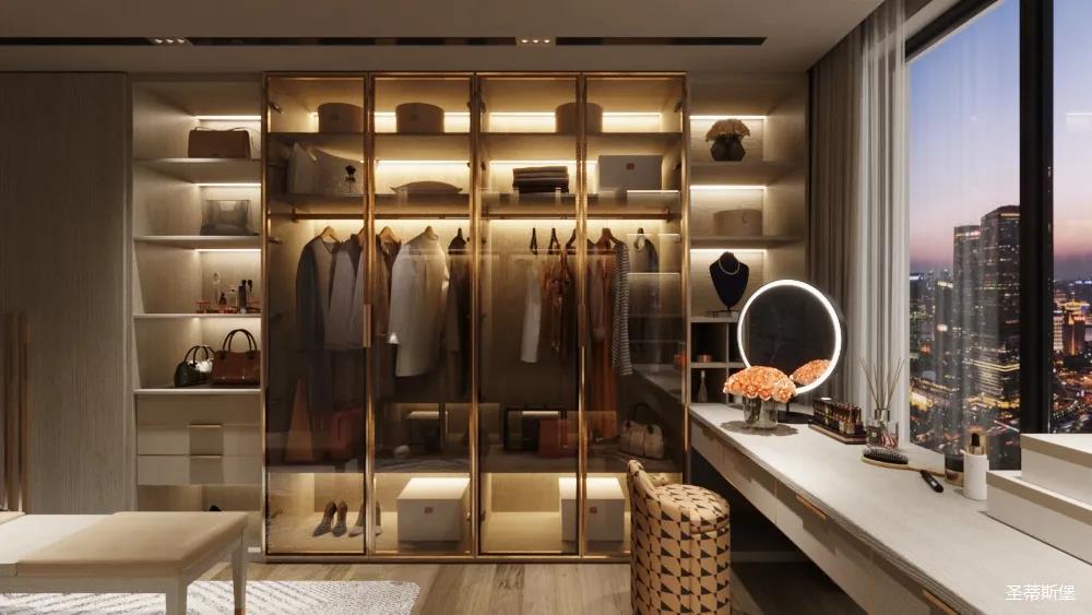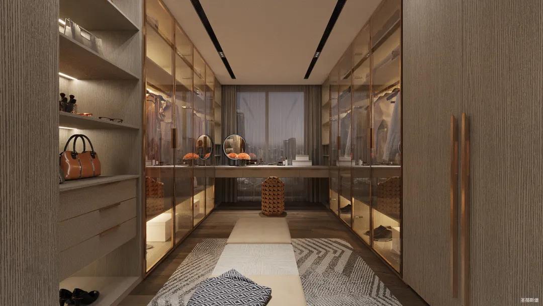 移步衣帽間,精簡華麗幾乎貫穿了整個空間,質感高級的實木定制柜框架、通透明亮的玻璃展示區、色調醇厚的金屬鑲邊,每一項細節搭配都在強調著業主的高端品位。妝臺前的落地窗讓我們在觀賞都市繁華的同時也屏蔽了都市喧囂,讓我們置身于繁華都市中有一處寧靜休憩地。