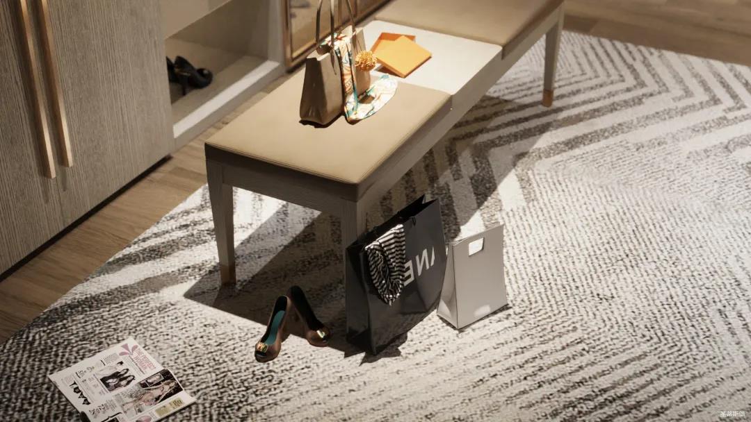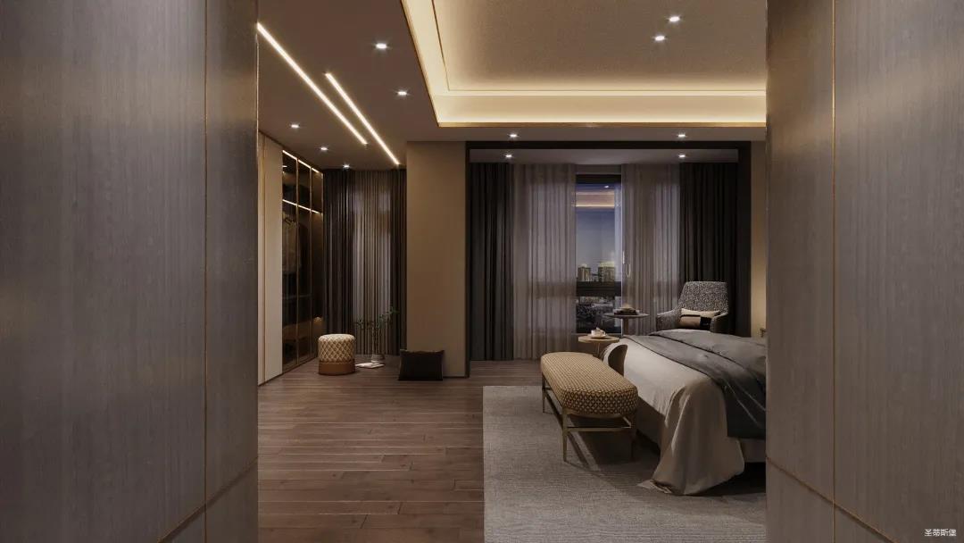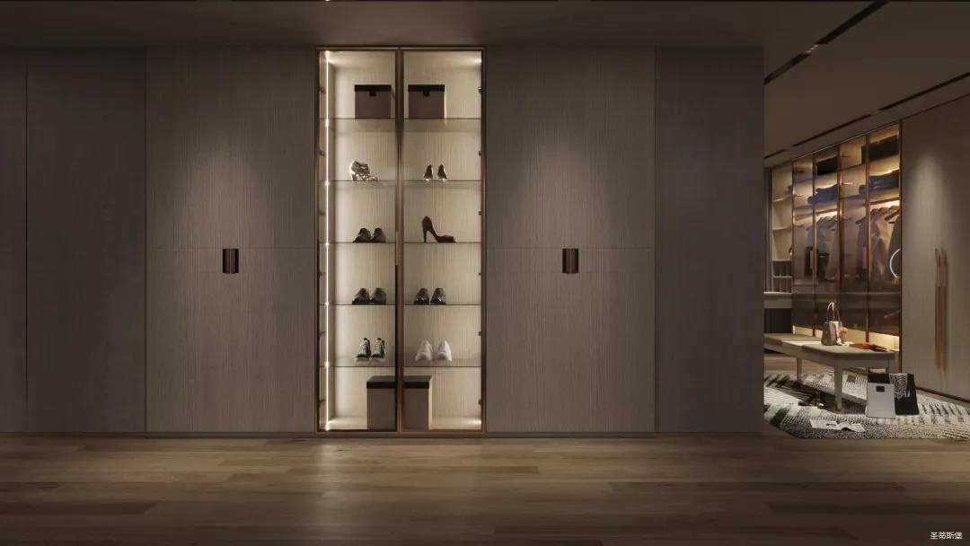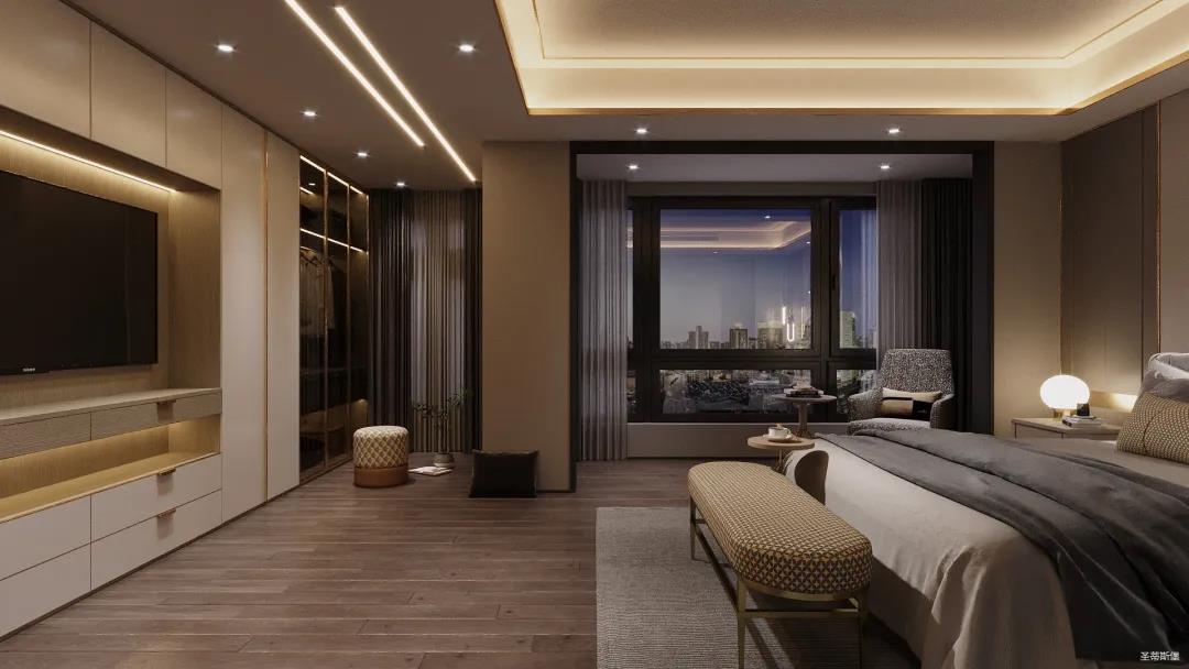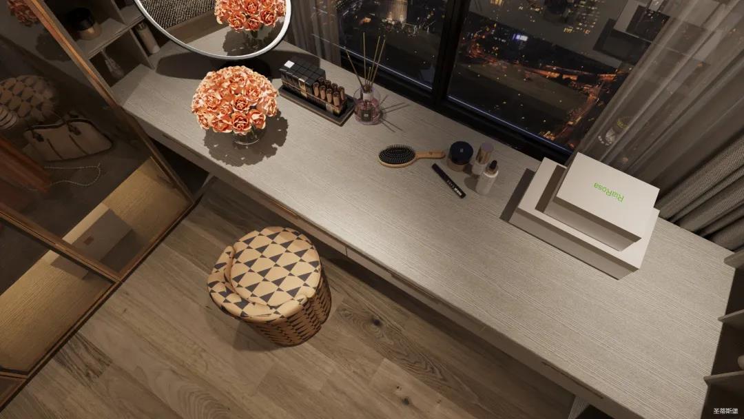 移步衣帽間,精簡華麗幾乎貫穿了整個空間,質感高級的實木定制柜框架、通透明亮的玻璃展示區、色調醇厚的金屬鑲邊,每一項細節搭配都在強調著業主的高端品位。妝臺前的落地窗讓我們在觀賞都市繁華的同時也屏蔽了都市喧囂,讓我們置身于繁華都市中有一處寧靜休憩地。