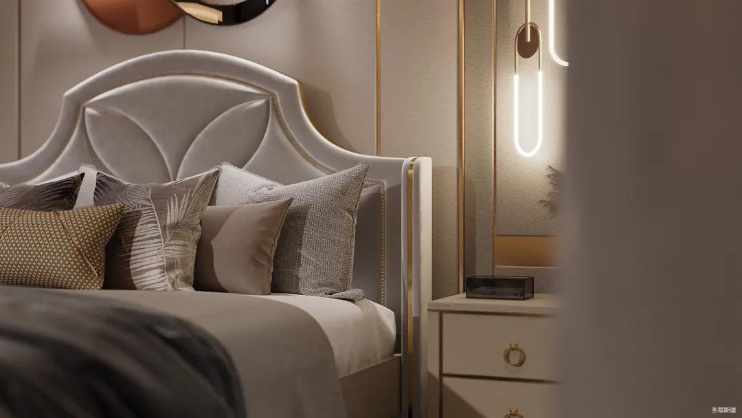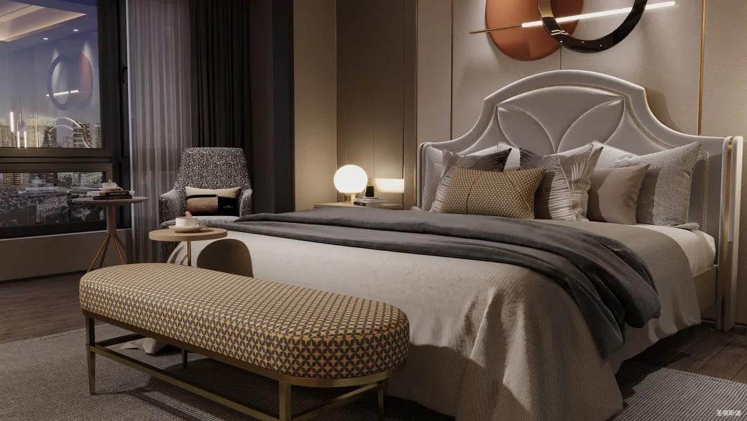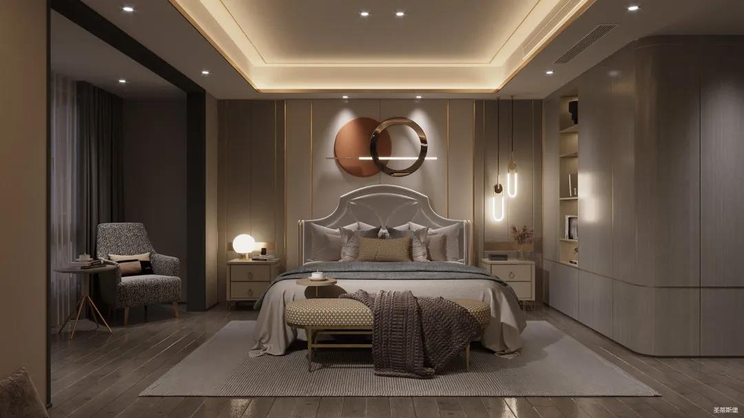 臥室空間整體以護墻板定制為主,整體設計注重空間簡約、自然,沒有繁雜的裝飾。結合業主對理想家的想象,采用暖色調來襯托溫馨實感,延伸業主對家的定義,用最質樸的木紋融合極簡線條平鋪的形式,體悟自然的溫度,為都市生活帶去不一樣的體驗感。