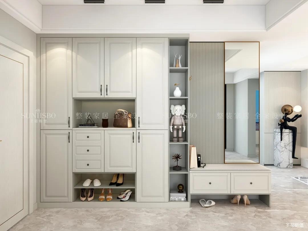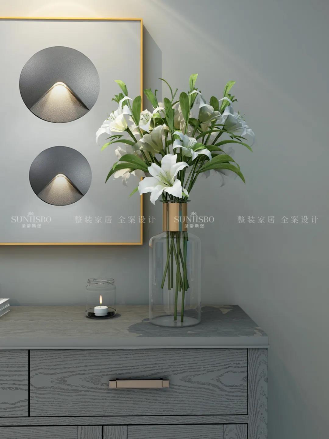 入戶側(cè)面設(shè)計(jì)一字型玄關(guān),腰部,底部留空做層板,便于隨手放置鑰匙、鞋包等物品,中間留空設(shè)計(jì)為開放展示區(qū),加上軟裝飾品點(diǎn)綴,達(dá)到業(yè)主對(duì)品質(zhì)生活追求的理想狀態(tài)。應(yīng)女主人要求,玄關(guān)還加長(zhǎng)延伸出妝鏡和換鞋凳,讓動(dòng)線自然流暢。