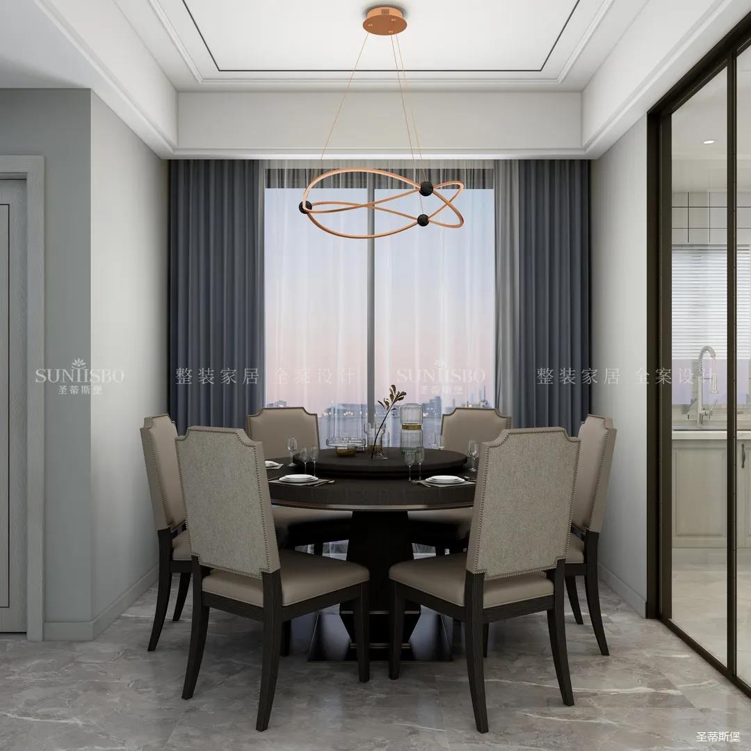 餐廳空間由于戶型空間有限,僅用淺色的護(hù)墻與深色的餐桌椅,在視覺上加深空間的縱深感,打造了滿足用餐、會(huì)客、社交的多重需求空間,把業(yè)主對(duì)一家人圍桌用餐的憧憬變成可落地居家場(chǎng)景。