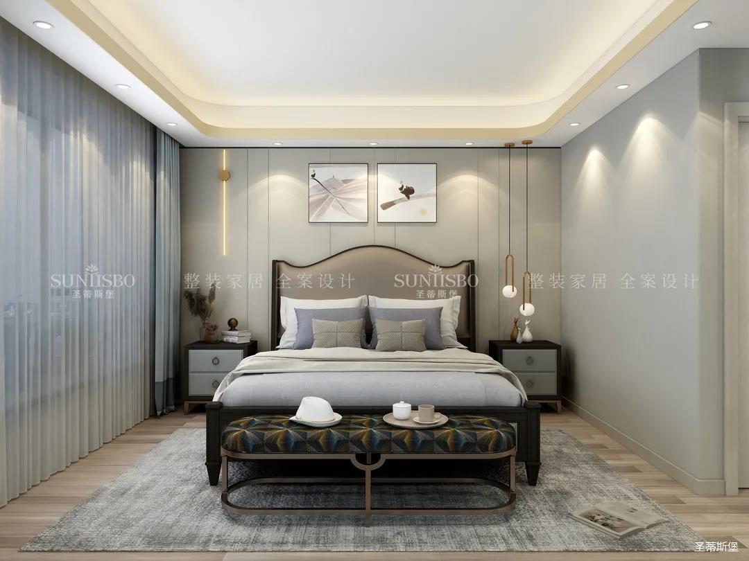 主臥整體暖色色系為空間注入了專屬調(diào)性,高明度的家具色彩與整體空間區(qū)分,透過材質(zhì)肌理與光線相互交疊,傳達(dá)著空間里安定溫暖的情緒。立體輕奢的床尾凳,提示著空間主人對(duì)時(shí)尚的高質(zhì)量生活追求。