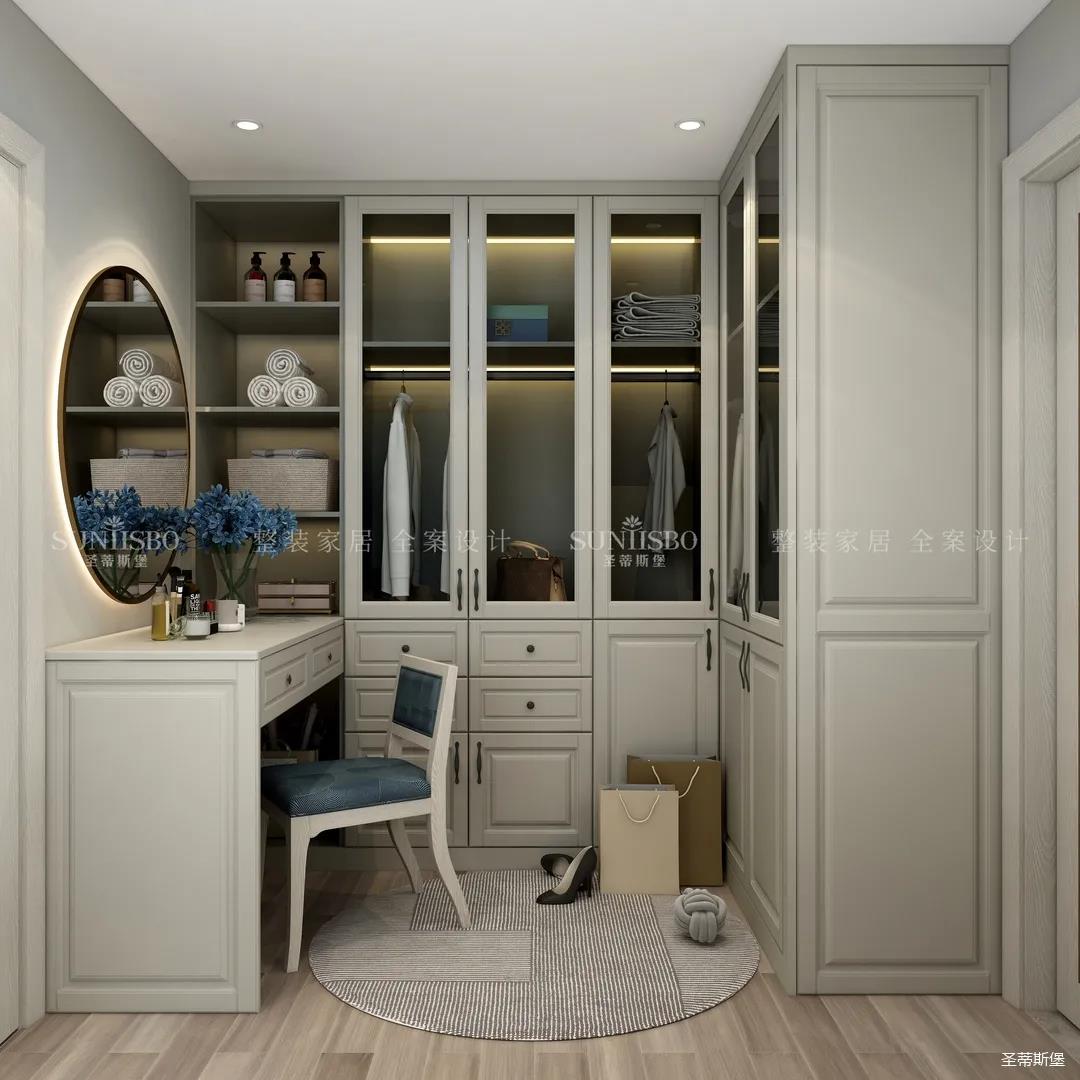 利用主臥多出來的小空間,設(shè)計(jì)打造出步入式衣帽間。定制了L型的轉(zhuǎn)角衣柜,提供了超強(qiáng)的收納空間。圓形的裝飾地毯與妝鏡相呼應(yīng),彰顯著空間女主人對(duì)精致生活的態(tài)度。