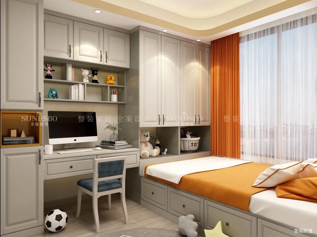 為給小朋友提供良好的居住環(huán)境,兒童房功能一應(yīng)俱全,兼具開放式與封閉收納,將兒童的學(xué)習(xí)區(qū)與休息區(qū)合理劃分,打造了一個(gè)良好的生活習(xí)性,仿古白的整體柜,巧妙的將明亮橙作為撞色,令空間充滿童趣與活力。