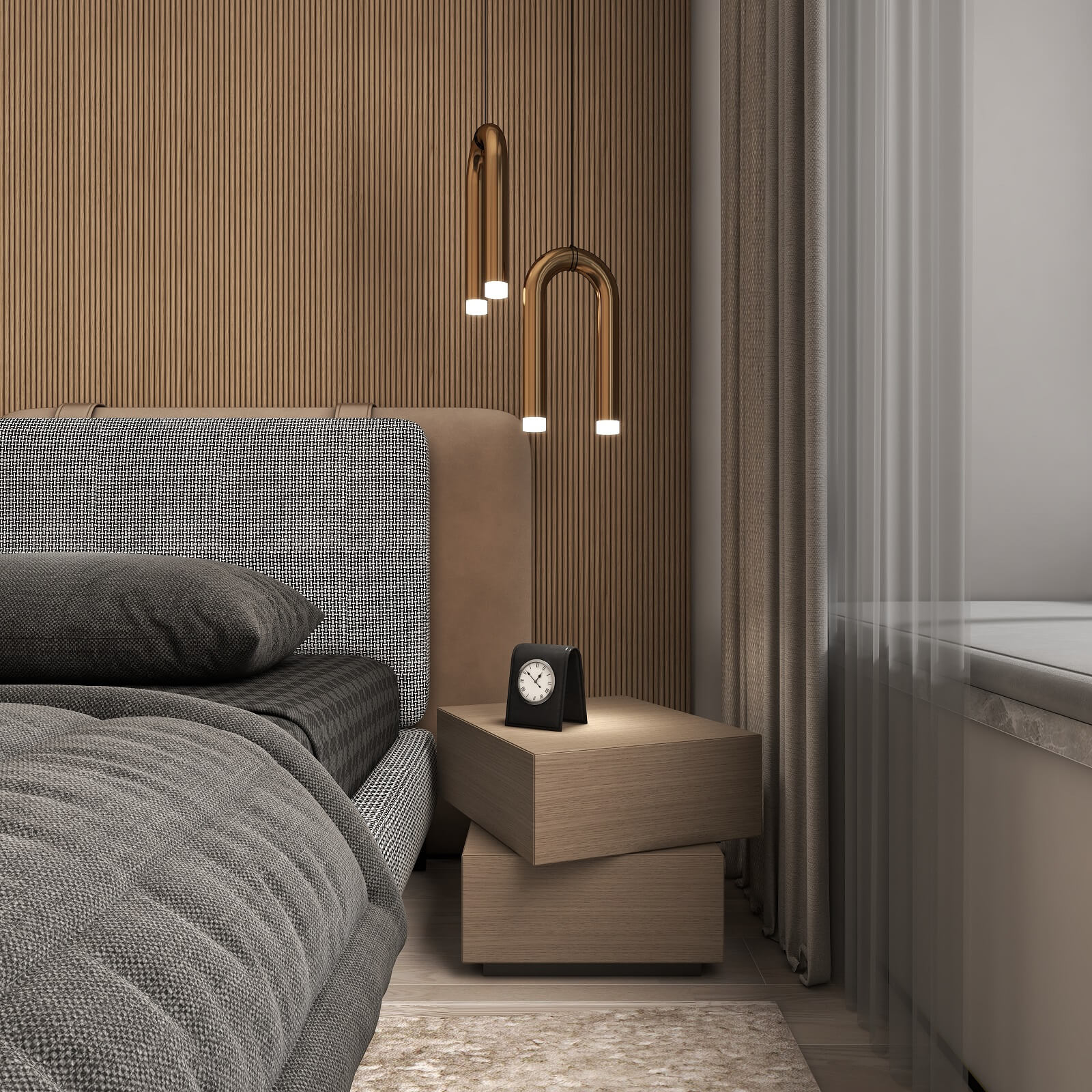 主臥的一切設(shè)計(jì),都有助于睡眠氛圍的營(yíng)造,黑棕色配合沉靜的物件,從材料到觸感,強(qiáng)調(diào)事物質(zhì)樸的內(nèi)在,能夠展示高端定制木作的本質(zhì)之美。